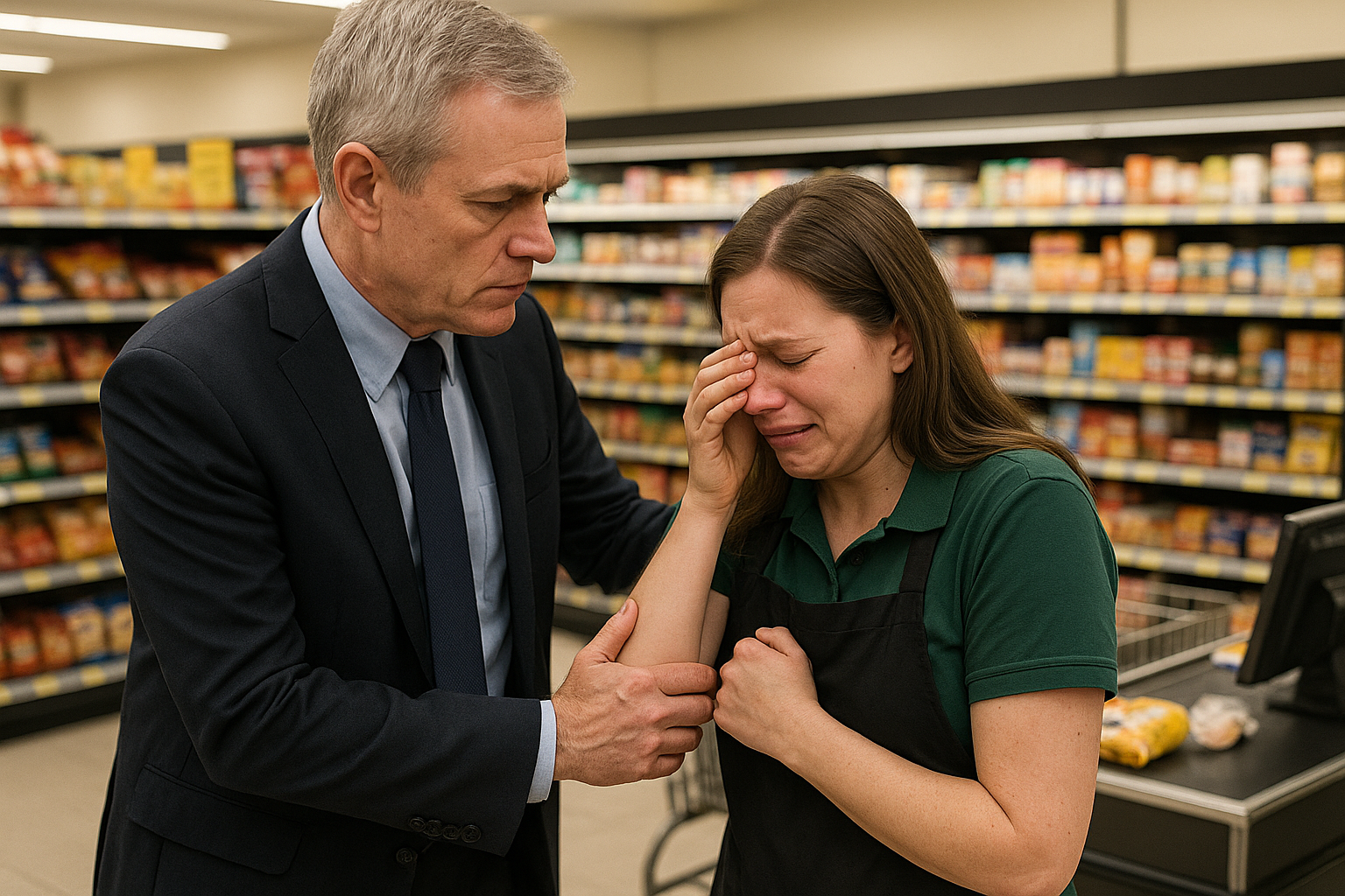 At the checkout counter, a woman scanned groceries with trembling hands. Her name tag read “Renee.” Her eyes were swollen, her smile cracked. Jonathan ducked behind an endcap display, pretending to study soup cans. He watched her swipe at her face with her sleeve, trying to hide the tears. That’s when a man burst from the backroom.