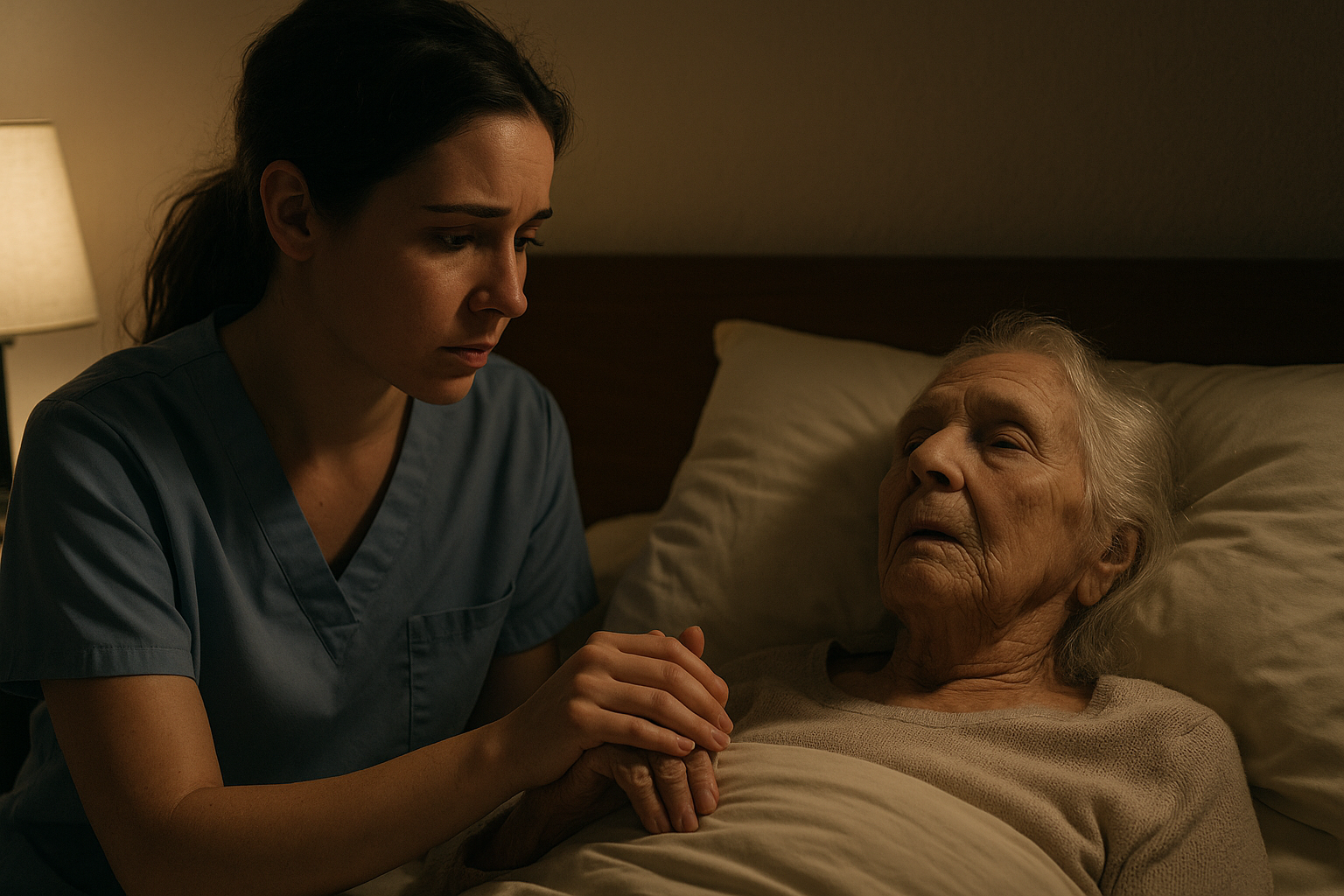The room was still, wrapped in the kind of silence that only comes in the very last hours of night. A faint glow from a bedside lamp painted soft shadows across the walls. On the bed lay an elderly woman, her breathing faint, her face serene. Time was slipping away, but there was no fear in her expression—just a calm acceptance, like someone who had made peace with the world.