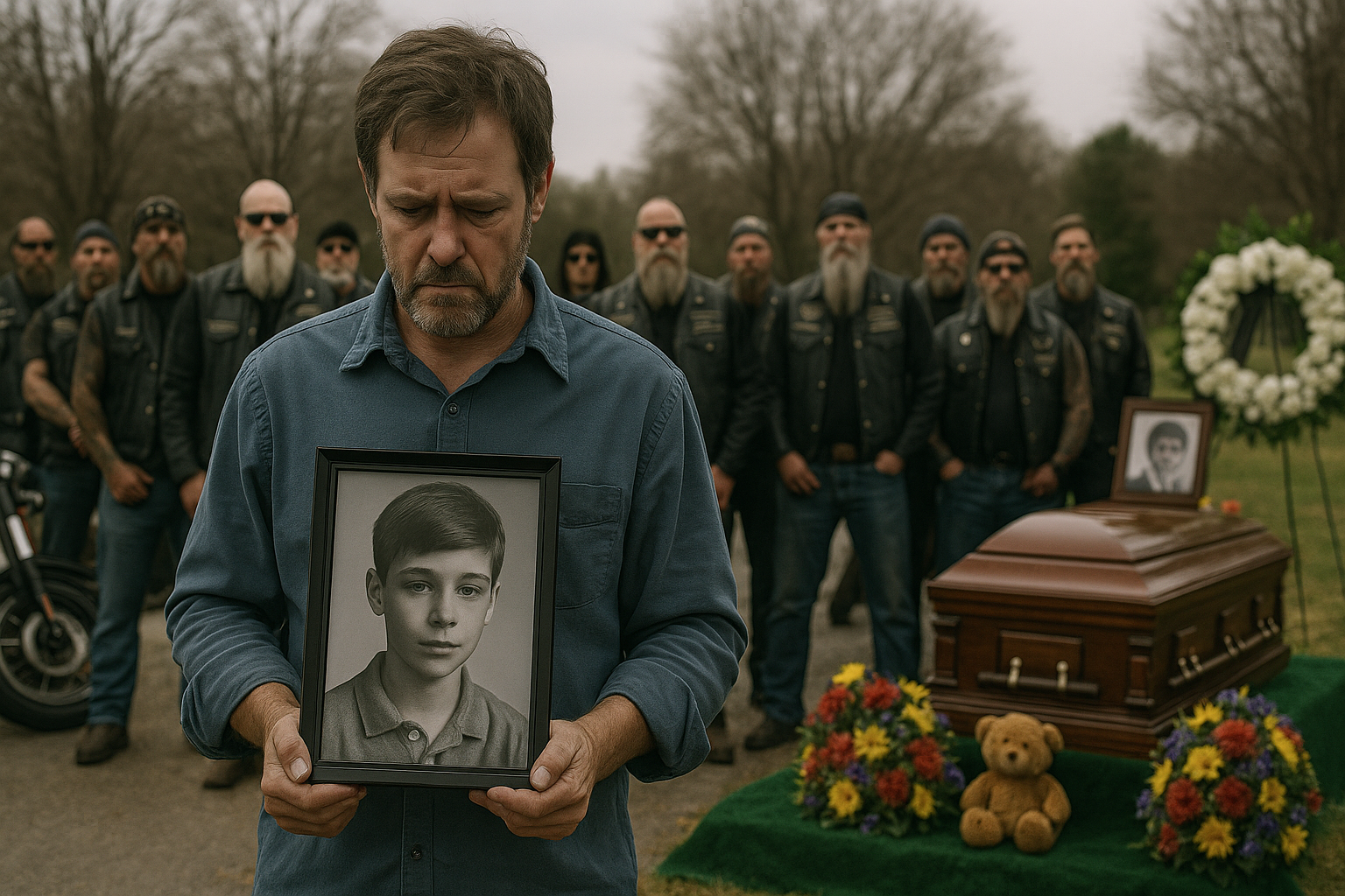 The moment dozens of bikers rumbled into the cemetery, forming a silent corridor of leather and sorrow, everything changed. They weren’t there to intimidate—they were there for Mikey, a quiet 14-year-old boy who had been bullied to the point of no return. His father, desperate for justice in a town that offered none, had made one late-night call after discovering his son’s heartbreaking journal. As the four boys who tormented Mikey arrived at the funeral, the bikers turned to face them—and in that still, powerful silence, everyone finally understood what Mikey had endured before he…