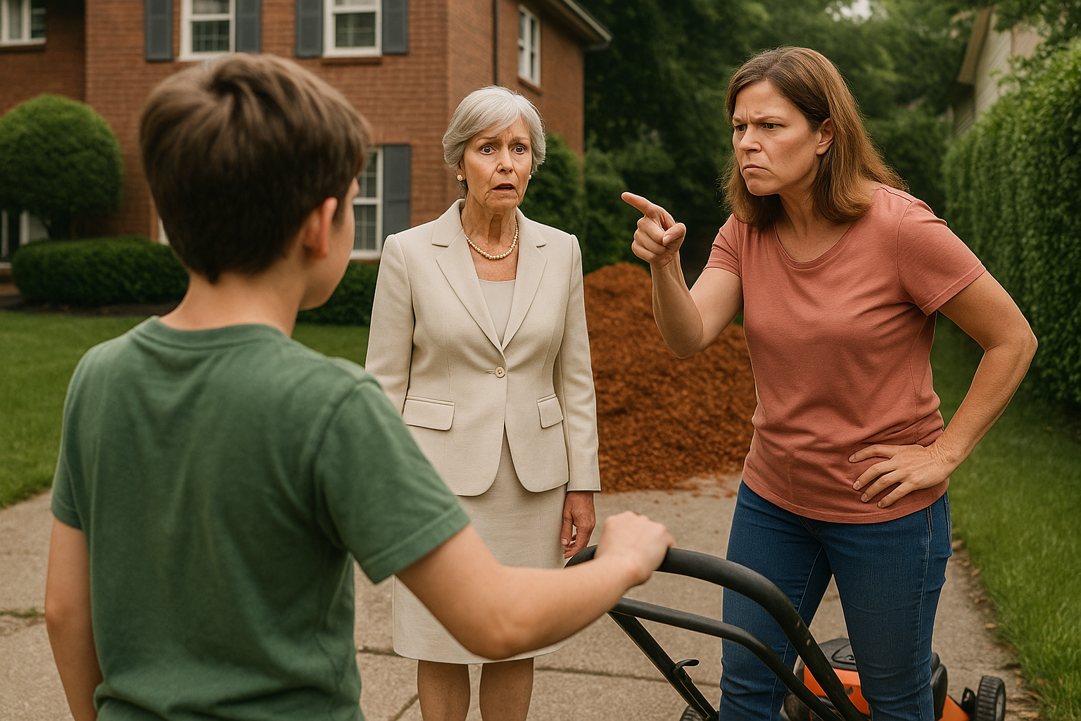 Twelve-year-old Mason spent two scorching days mowing Mrs. Langley’s massive lawn, eager to earn money for a gift for his grandmother. But when the job was done, Mrs. Langley refused to pay, claiming the “lesson” was reward enough. Mason’s disappointment was obvious—until his mother, Claire, found out. She didn’t yell or plead. Instead, she made a few quiet calls. The next morning, Mrs. Langley returned to find her pristine hedges misshapen and her driveway buried under mounds of mulch. As she stood in shock, surrounded by watching neighbours, Claire stepped outside and calmly said…