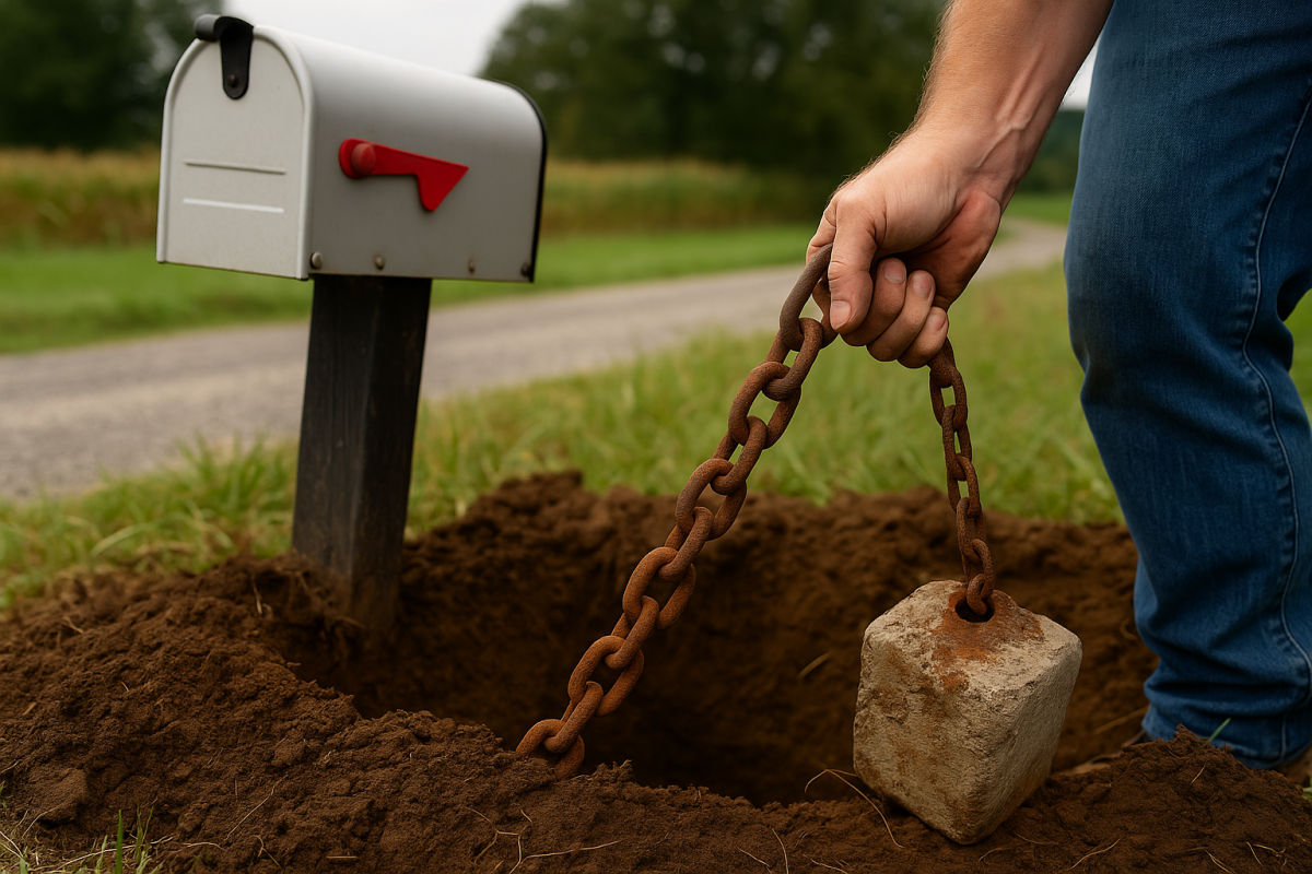 As I followed the length of chain deeper into the soil, I uncovered a large metal anchor encased in a concrete block. The whole setup was like something you’d use to moor a boat—only this wasn’t near any body of water. It was part of the old mailbox’s foundation.