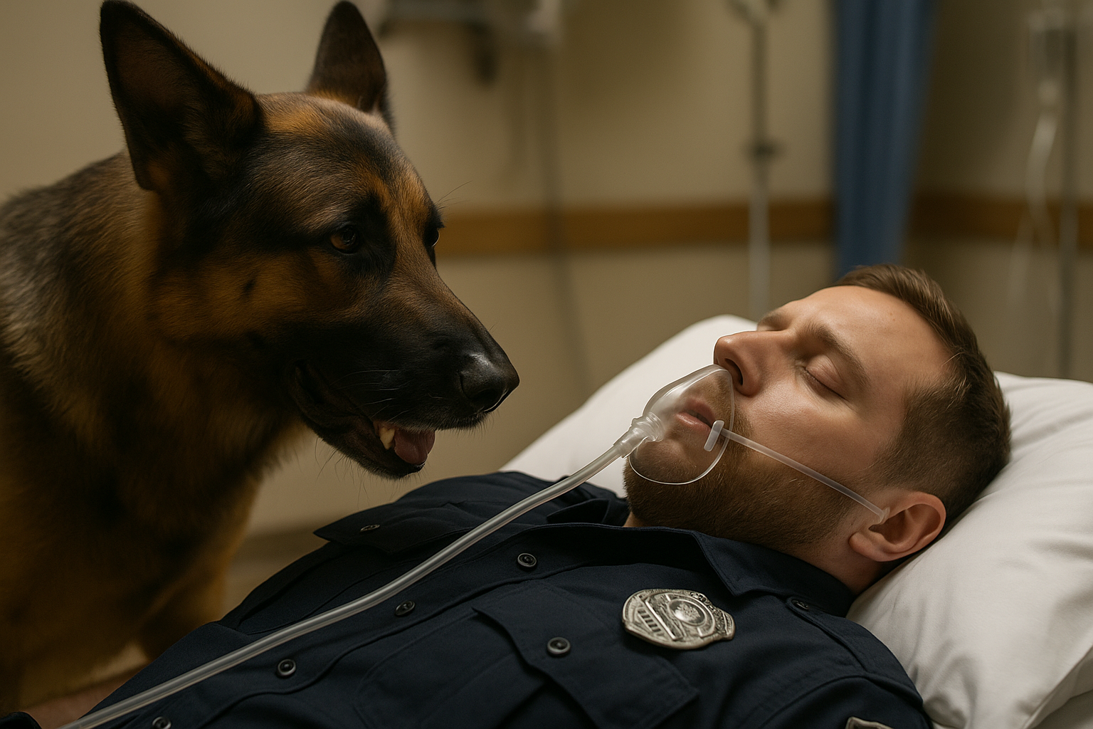 Officer Luke Bennett was ambushed during a manhunt and left for dead—until his K9 partner, Shadow, fought off a knife-wielding attacker and saved him. Luke slipped into a coma, and Shadow never left his bedside. For months, he waited, silent and still, as if guarding something only he could feel. One night, Shadow bolted to fetch a nurse—just as Luke’s fingers twitched. A sign of life. But Shadow’s greatest moment came later, when Luke’s heart stopped and the medics gave up, Shadow stood guard, growling low, when suddenly…